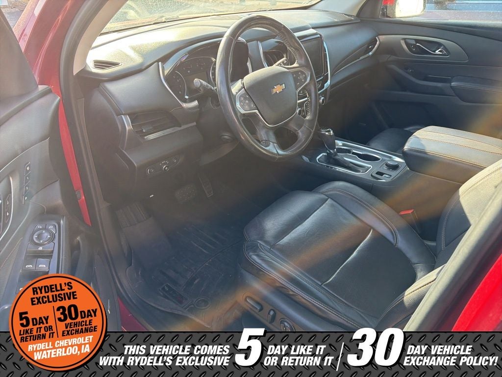 Clean CARFAX. CARFAX One-Owner. AWD, 10 Speakers, 3.49 Axle Ratio, 3rd row seats: split-bench, 4-Wheel Disc Brakes, 7-Passenger Seating (2-2-3 Seating Configuration), ABS brakes, Air Conditioning, Alloy wheels, AM/FM radio: SiriusXM, Apple CarPlay/Android Auto, Auto High-beam Headlights, Auto-dimming door mirrors, Auto-dimming Rear-View mirror, Automatic temperature control, Bose Premium 10-Speaker Audio System Feature, Brake assist, Bumpers: body-color, Compass, Delay-off headlights, Driver door bin, Driver vanity mirror, Dual front impact airbags, Dual front side impact airbags, Electronic Stability Control, Emergency communication system: OnStar Guidance, Four wheel independent suspension, Front anti-roll bar, Front Bucket Seats, Front Center Armrest, Front dual zone A/C, Front fog lights, Front License Plate Bracket Mounting Package, Front reading lights, Fully automatic headlights, Garage door transmitter, Heated door mirrors, Heated front seats, Heated rear seats, Heated steering wheel, Heavy-Duty Cooling System, Illuminated entry, Low tire pressure warning, Memory seat, Navigation System, Occupant sensing airbag, Outside temperature display, Overhead airbag, Overhead console, Panic alarm, Passenger door bin, Passenger vanity mirror, Perforated Leather-Appointed Seat Trim, Power door mirrors, Power driver seat, Power Liftgate, Power passenger seat, Power steering, Power windows, Preferred Equipment Group 1LZ, Premium audio system: Chevrolet MyLink, Radio data system, Radio: Chevrolet MyLink AM/FM Stereo w/Navigation, Rear air conditioning, Rear anti-roll bar, Rear reading lights, Rear window defroster, Rear window wiper, Remote keyless entry, Roof rack: rails only, Security system, SiriusXM Satellite Radio, Speed control, Speed-sensing steering, Spoiler, Steering wheel memory, Steering wheel mounted audio controls, Tachometer, Telescoping steering wheel, Tilt steering wheel, Traction control, Trip computer, Turn signal indicator mirrors, Variably intermittent wipers, Ventilated front seats, Voltmeter, Wheels: 20 Argent Metallic Machine Faced Aluminum, AWD. Cajun Red Tintcoat 2018 Chevrolet Traverse Premier AWD 9-Speed Automatic 3.6L V6 SIDI VVT