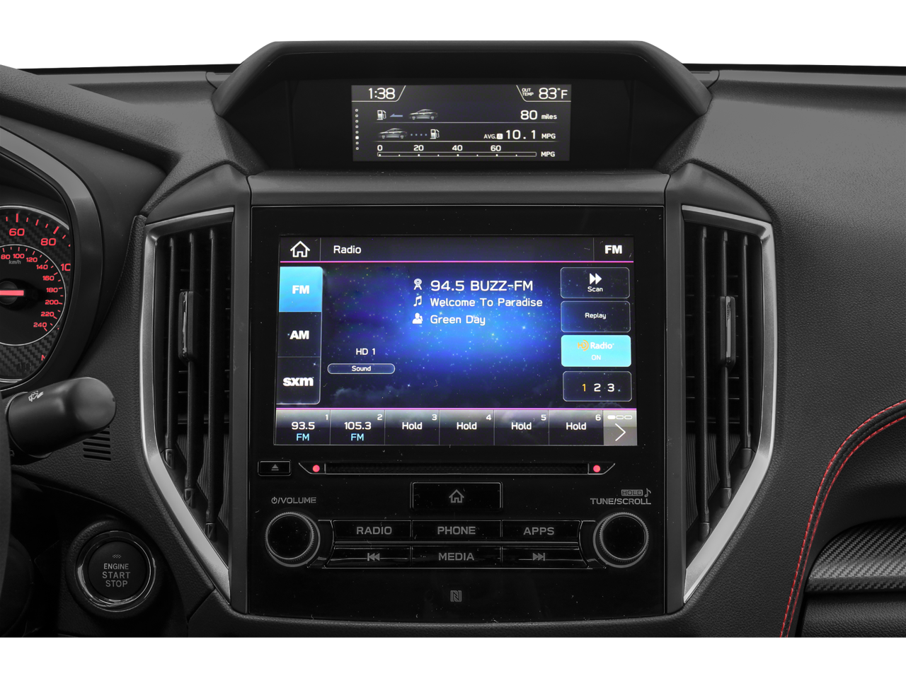 - Radio: Subaru STARLINK 8.0" Multimedia Plus System -inc: AM/FM stereo, HD radio, single disc CD player, MP3/WMA/CRR/RW file capability, multi touch gesture high resolution 8.0 LCD display screen, voice activated controls, Bluetooth® audio streaming connectivity, Bluetooth® hands-free phone connectivity, Bluettoth hands-free sms text messaging connectivity (applicable w/compatible cell phone), Near Field Communication (NFC), iPod control capability, rear-vision camera display, SiriusXM All Access radio (subscription required), SiriusXM Travel Link (subscription required), smartphone integration, AHA, Android Auto, CarPlay, Pandora, 6 speakers, 3.5mm auxiliary input jack, dual USB ports, roof mounted antenna and audio/satellite connected services