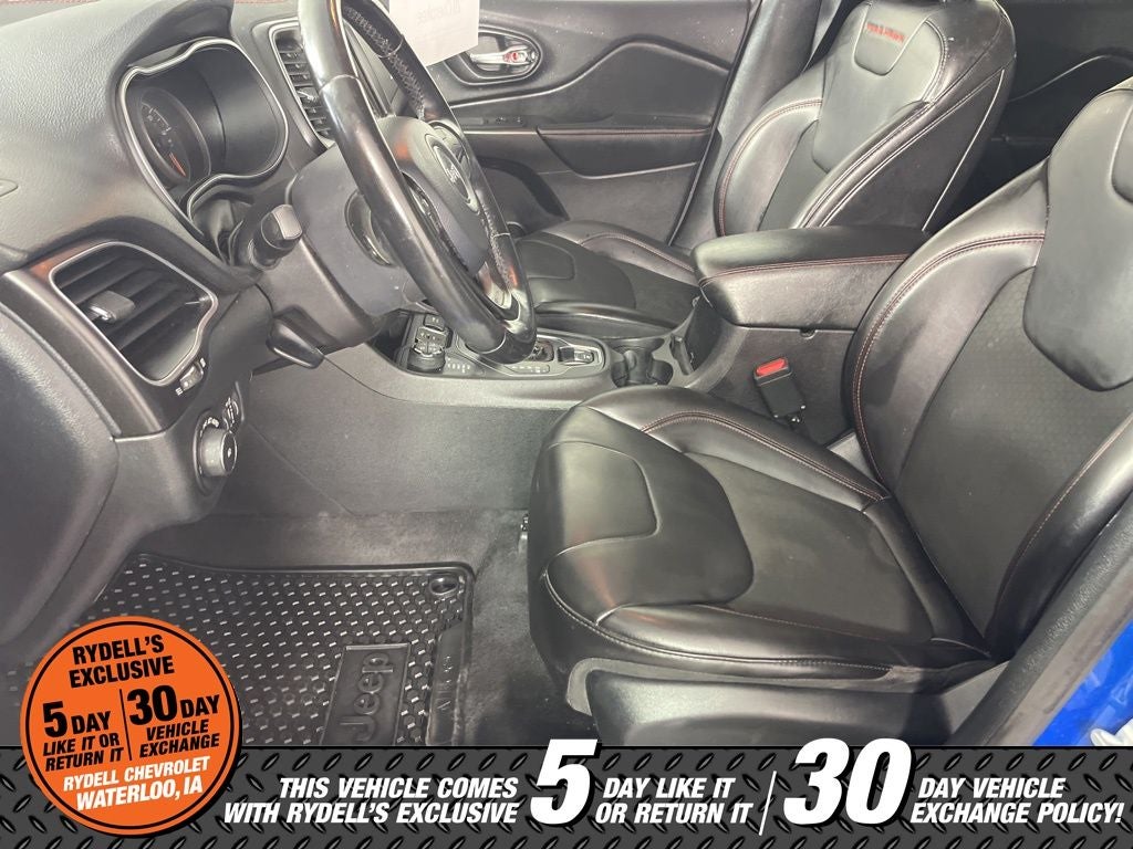 3.517 Axle Ratio, 4-Wheel Disc Brakes, 6 Speakers, 8.4 Touchscreen Display, ABS brakes, Air Conditioning, Alloy wheels, AM/FM radio: SiriusXM, Anti-whiplash front head restraints, Apple CarPlay, Apple CarPlay/Android Auto, Automatic temperature control, AutoStick Automatic Transmission, Auxiliary Transmission Oil Cooler, Brake assist, Cloth/Premium Vinyl Bucket Seats, Compass, Delay-off headlights, Driver door bin, Driver vanity mirror, Dual Bright Exhaust Tips, Dual front impact airbags, Dual front side impact airbags, Electronic Stability Control, Engine Oil Cooler, Exterior Mirrors Courtesy Lamps, Exterior Mirrors w/Supplemental Signals, Four wheel independent suspension, Front anti-roll bar, Front Bucket Seats, Front Center Armrest, Front dual zone A/C, Front fog lights, Front reading lights, Fully automatic headlights, Google Android Auto, GPS Antenna Input, Heated door mirrors, Hill Descent Control, Illuminated entry, Integrated Voice Command w/Bluetooth®, Knee airbag, Leather Shift Knob, Low tire pressure warning, Occupant sensing airbag, Off Road Suspension, Outside temperature display, Overhead airbag, Overhead console, Panic alarm, ParkView Rear Back-Up Camera, Passenger door bin, Passenger vanity mirror, Power door mirrors, Power driver seat, Power steering, Power windows, Quick Order Package 27E Trailhawk, Radio data system, Radio: Uconnect 4 w/8.4 Display, Rear anti-roll bar, Rear reading lights, Rear seat center armrest, Rear side impact airbag, Rear window defroster, Rear window wiper, Remote keyless entry, Roof rack: rails only, SiriusXM Satellite Radio, Speed control, Speed-sensing steering, Split folding rear seat, Spoiler, Steering wheel mounted audio controls, Stop-Start Multiple VSM System, Tachometer, Telescoping steering wheel, Tilt steering wheel, Traction control, Trip computer, Turn signal indicator mirrors, USB Host Flip, Variably intermittent wipers, Voltmeter, Wheels: 17 x 7.5 Painted Diamond Cut Aluminum. Hydro Blue Pearlcoat 2020 Jeep Cherokee Trailhawk 4WD 9-Speed 948TE Automatic 3.2L V6