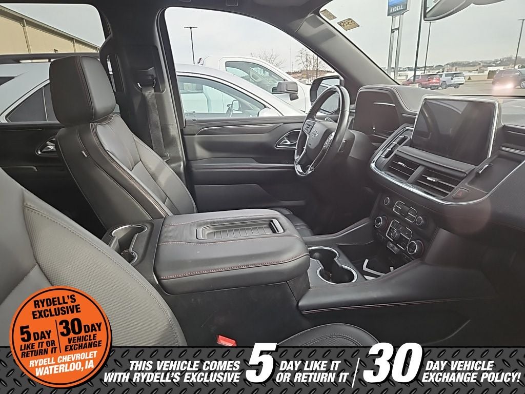 CARFAX One-Owner. 4WD, Jet Black/Victory Red Leather, 10-Way Power Driver & Passenger Seat Adjusters, 1st & 2nd Row Color-Keyed Carpeted Floor Mats, 2nd Row Pwr Release 60/40 Split-Folding Bench Seat, 3.23 Rear Axle Ratio, 3rd Row 60/40 Power-Folding Split-Bench Seat, 3rd row seats: split-bench, 4-Wheel Disc Brakes, 9 Speakers, ABS brakes, Air Conditioning, Alloy wheels, AM/FM radio: SiriusXM with 360L, Apple CarPlay/Android Auto, Auto High-beam Headlights, Auto-Dimming Inside Rear-View Mirror, Auto-dimming Rear-View mirror, Automatic Stop/Start, Automatic temperature control, Bose 9-Speaker Stereo Audio System Feature, Brake assist, Bright Front & Rear Door Sill Plates, Bumpers: body-color, Color-Keyed Carpeting Floor Covering, Compass, Delay-off headlights, Driver & Front Outboard Passenger Airbags, Driver Alert Package, Driver door bin, Driver vanity mirror, Dual Exhaust System, Dual front impact airbags, Dual front side impact airbags, Dual-Pane Power Panoramic Sunroof, Electronic Stability Control, Emergency communication system: OnStar and Chevrolet connected services capable, Enhanced Driver Information Center, Floor Console w/Storage Area, Four wheel independent suspension, Front anti-roll bar, Front Bucket Seats, Front Center Armrest, Front dual zone A/C, Front High-Back Reclining Bucket Seats, Front reading lights, Fully automatic headlights, Garage door transmitter, Hands-Free Rear Power Programmable Liftgate, HD Surround Vision, Heated 2nd Row Outboard Seats, Heated door mirrors, Heated Driver & Front Passenger Seats, Heated front seats, Heated Steering Wheel, Illuminated entry, Infotainment Display, Lane Change Alert w/Side Blind Zone Alert, Leather steering wheel, Leather-Wrapped Steering Wheel, LED Daytime Running Lamps, License Plate Front Mounting Package, Low tire pressure warning, Luxury Package, Magnetic Ride Control Suspension, Memory seat, Memory Settings, Memory Settings for Driver, Navigation System, Not Equipped w/Front & Rear Park Assist, Not Equipped w/Steering Column Lock, Occupant sensing airbag, Outside Heated Power-Adjustable Mirrors, Outside temperature display, Overhead airbag, Overhead console, Panic alarm, Passenger door bin, Passenger vanity mirror, Perforated Leather Seat Trim, Power door mirrors, Power driver seat, Power Liftgate, Power passenger seat, Power steering, Power Tilt & Telescopic Steering Column, Power windows, Preferred Equipment Group 1SP, Premium audio system: Chevrolet Infotainment System 3, Premium Smooth Ride Suspension, Radio: Chevrolet Infotainment 3 Premium System, Rain sensing wipers, Rear air conditioning, Rear anti-roll bar, Rear Cross Traffic Alert, Rear Pedestrian Alert, Rear reading lights, Rear seat center armrest, Rear window defroster, Rear window wiper, Remote keyless entry, Remote Start, Roof rack: rails only, Security system, Set of 4 Wheel Locks (LPO), SiriusXM Radio w/360L, Speed control, Speed-sensing steering, Split folding rear seat, Spoiler, Sport Performance Package, Start/Stop System Disable Button, Steering wheel mounted audio controls, Tachometer, Telescoping steering wheel, Tilt steering wheel, Traction control, Trip computer, Universal Home Remote, Variably intermittent wipers, Voltmeter, Wheels: 22 x 9 Bright Machined, Wireless Charging, 4WD, Jet Black/Victory Red Leather. Black 2022 Chevrolet Tahoe RST 4WD 10-Speed Automatic with Overdrive EcoTec3 6.2L V8